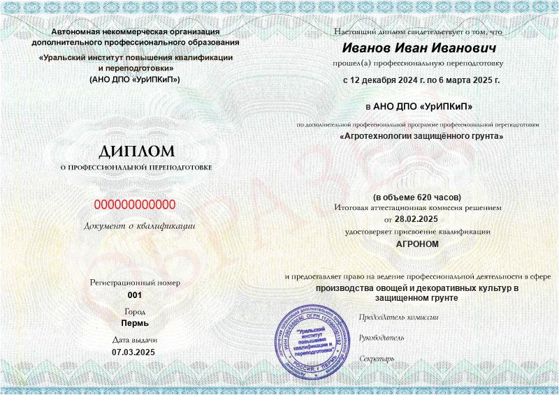 - Диплом о профессиональной переподготовке с присвоением квалификации «Агроном». Вносится в Федеральный реестр документов об образовании.