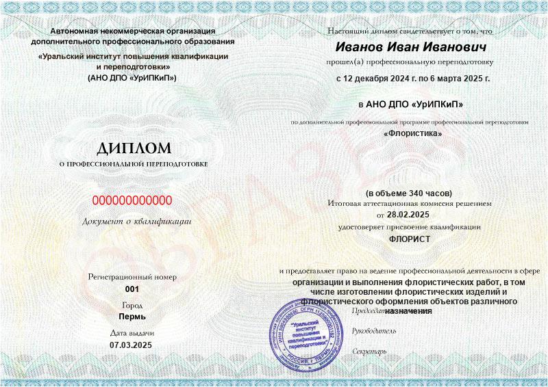 - Диплом о профессиональной переподготовке с присвоением квалификации «Флорист» или свидетельство о прохождении обучения.