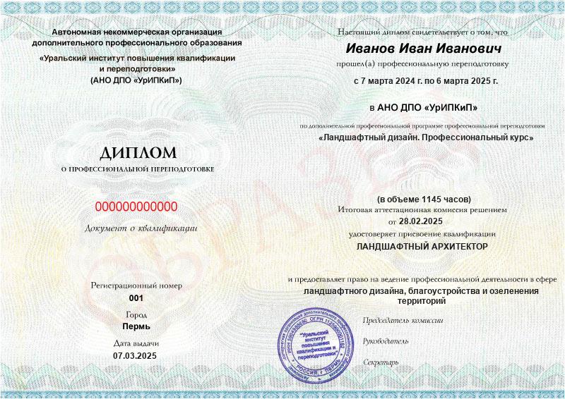 - Московский диплом о профессиональной переподготовке установленного образца с присвоением квалификации «Ландшафтный архитектор».